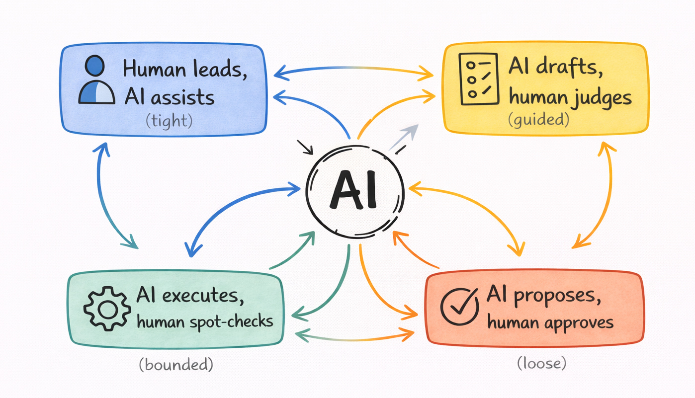 Take AI-assisted code. Eighteen months ago, most engineering teams had it squarely in AI drafts, human judges — AI generated the code, a human read every line carefully because you couldn’t trust it. Today, for a lot of teams, routine code has migrated toward AI executes, human spot-checks — the model is reliable enough, the review is lighter, and you’re mostly watching for drift. For novel architectural work, it might still be human leads, AI assists. Same technology. Same company. Different modes for different kinds of code — and the boundaries have moved in just eighteen months.