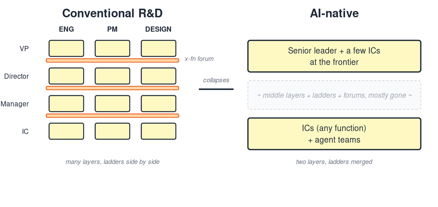 A conventional R&D org has many function ladders, each many layers deep, connected by cross-functional review forums between layers. The AI-native version collapses all of it — the ladders merge, the middle layers go, the x-functional forums mostly go too.